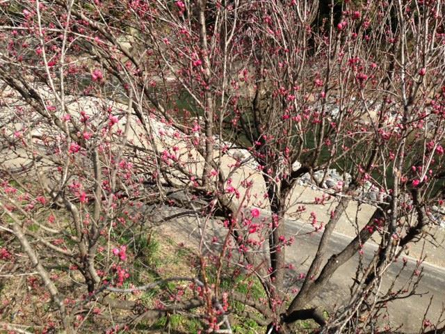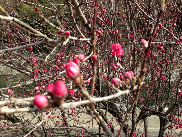川沿いの紅梅は蕾をいっぱいつけて、日差しを浴び次々と咲き出している様子です!(^^)!
