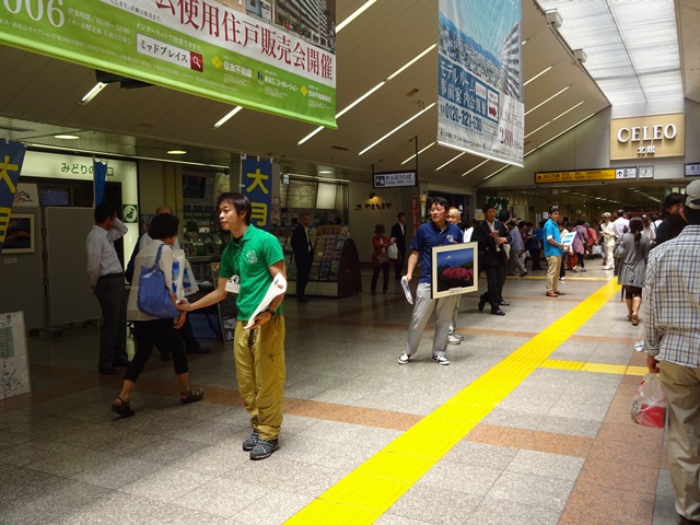 行き交う人々に丁寧にパンフレットを手渡しされる駅長さん