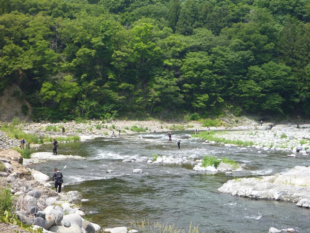いよいよ今年も鮎の解禁日を迎えました。 気温も高く、ここのところ雨も降っていないため、水量が少なめで 心配をしていましたが、多くの鮎釣りファンの皆さんが、素晴らしい釣果を おさめていました。 本当に鮎釣り日和です。 笹子川