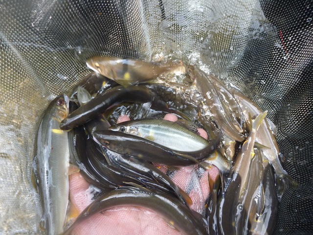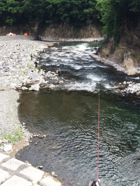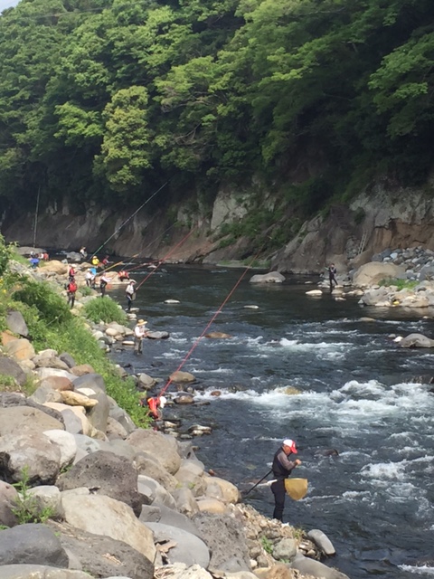 15センチから18センチぐらいの型が多いようでしたが、今後の成長が楽しみですね。 多い方はこの時点で50匹を超えていらっしゃいました。 本当によく釣れていました。お声をかけるのも気が引けるくらい 皆さん黙々と釣り上げていらっしゃいました。 お話をお聞きした埼玉の方、日野からいらした方々は 今日も車中泊をし、明日も楽しんで帰るそうです。 明日も天気予報は晴れ。 充分楽しんでいただけるのではないでしょうか?? まだ7月上~中旬にも成魚1トンの放流の予定もある等 楽しみは尽きません。 是非桂川の鮎に会いに来てください。