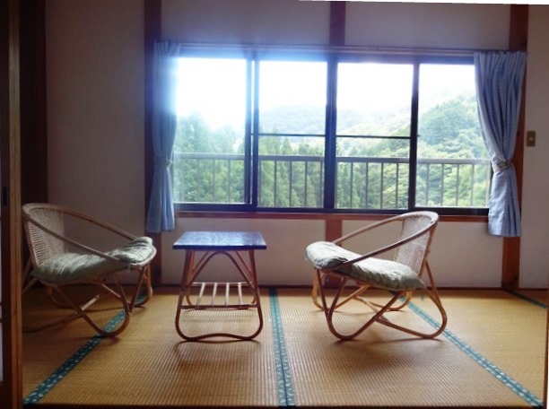 窓辺からは山々の緑と綺麗な青空が見え、すぐそばを流れる川のせせらぎに心癒されるとっても落ち着いたお部屋です。