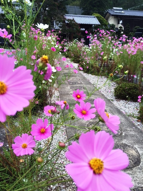 お寺の参道沿いには、満開のコスモスが風に揺られています。