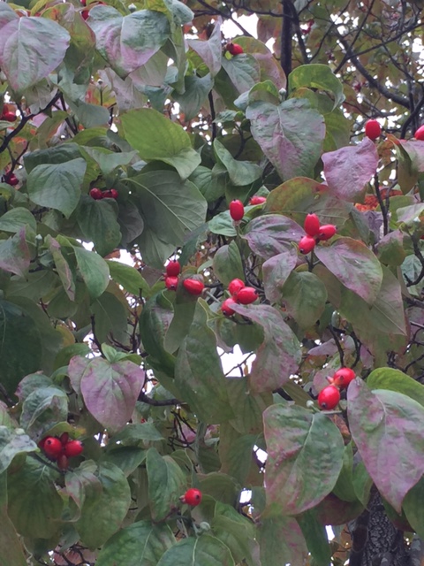 あちらこちらのハナミズキの街路樹も葉が色づき、実の朱が美しいです。