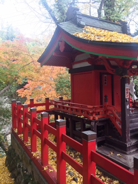 赤い山王宮に落葉したイチョウの黄色がとても綺麗です。