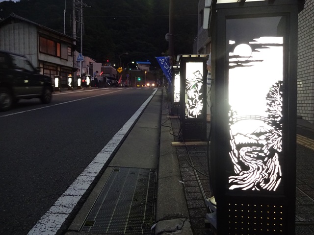 日が沈み辺りが暗くなるとあんどん街道の行燈に灯かりが燈りとても幻想的な光景に感激しました。