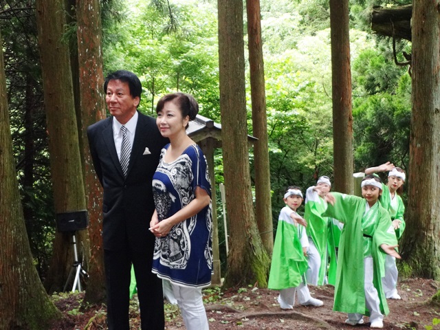 式典の後には『じょいそーらん』により演舞が行われ、メンバーと共に記念撮影されるご夫妻。