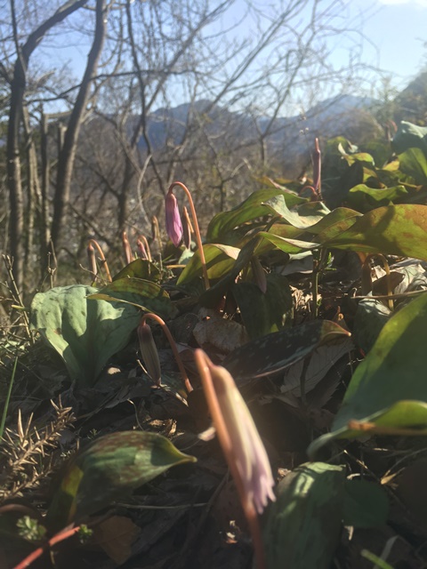 急斜面の登山道を登りあげると、地元の方々が大切に守っているカタクリの群生が