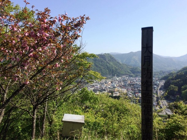 むすび山の山頂からは見晴らしがよく、岩殿山が見えていますが戦争中は空からの攻撃を見張る、監視場所となっていました。 その名残が今も残ります。