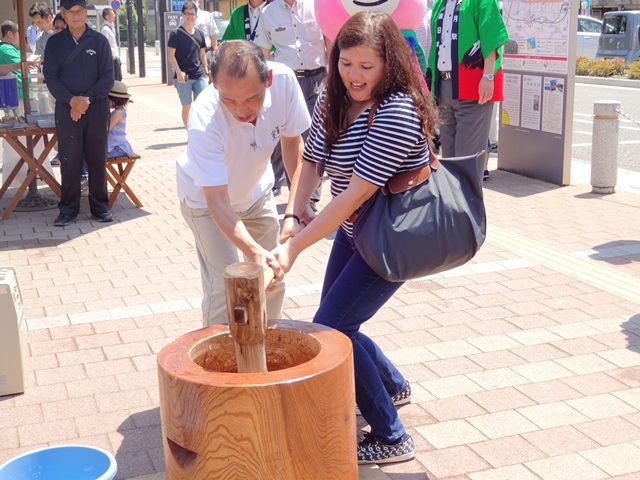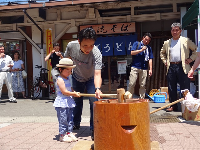 強い日差しの下JR大月駅長の開始の合図で、お祝いの餅つきが賑やかに行われました。