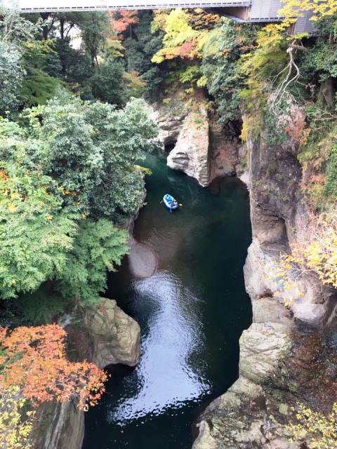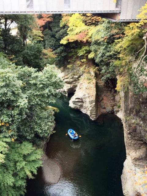 紅葉シーズンとなって、猿橋の橋の下を川下りするボートは毎日運航しています。