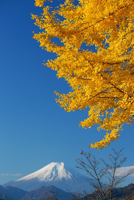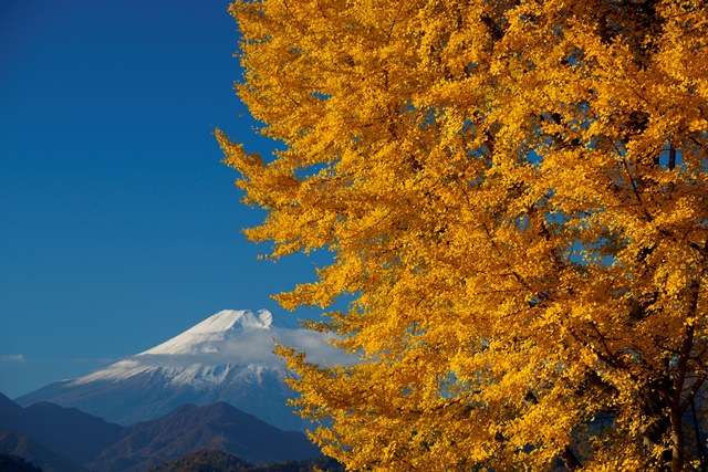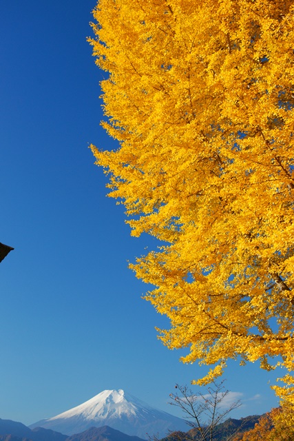 青空と富士山と真っ黄色の大きなイチョウの木・・本当に素晴らしいショットです!!