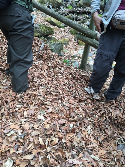 かな広葉樹の森は落ち葉のラッセル。 ひざ下まで落ち葉に埋もれながら下りました。