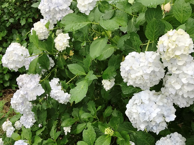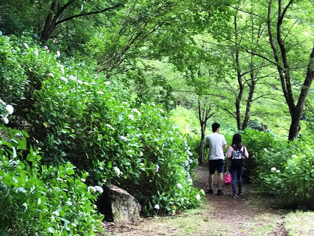 朝方まで激しく降っていた雨のお蔭で 遊歩道の紫陽花の花が元気に咲いてくれている感じです。