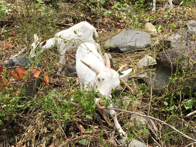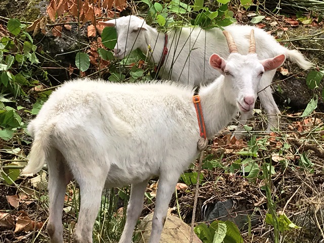 ボート乗り場へ向かう小路も紫陽花が綺麗ですよ。 今日は草刈り隊の山羊さんたちが来てくれています!!