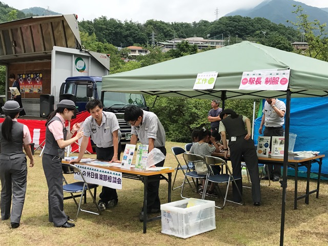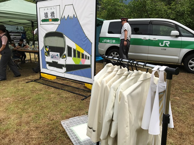 こちらはJR大月駅さんの出展ブース 子供たちに駅長さんの恰好で記念写真を撮ってもらう人気コーナーです。