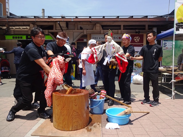 大月駅前で餅つきの記念イベントが行われました。