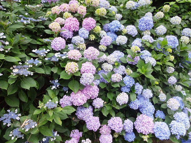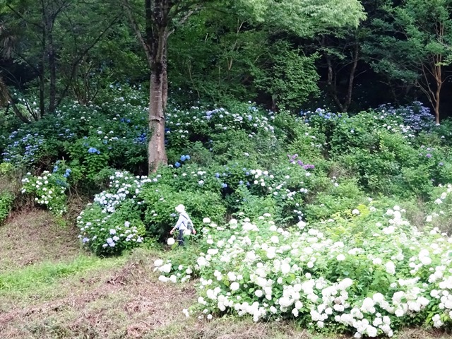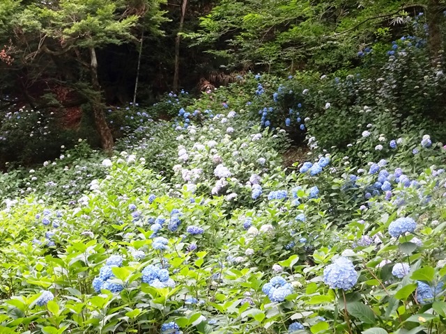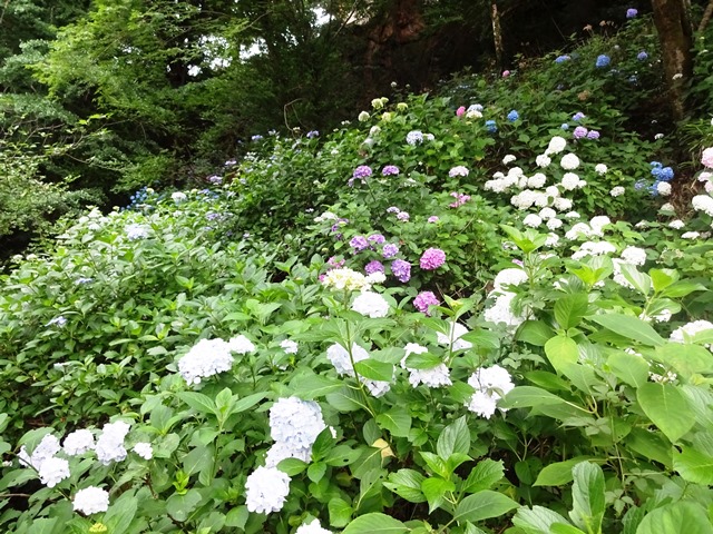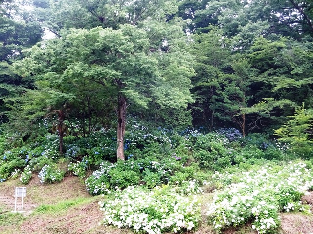 ボート乗り場から遊歩道の方向を見ると、ご覧の様に紫陽花が一面に綺麗に咲いています。