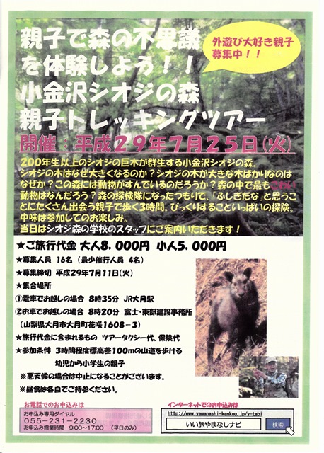 夏休みに向けて親子で楽しめるトレッキングツアーのご案内です!! 普段は滅多に入ることの出来ない小金沢シオジの森の中を 専門のガイドの案内で沢山の森の不思議を体験・・。 親子で森の探検にでかけませんか。