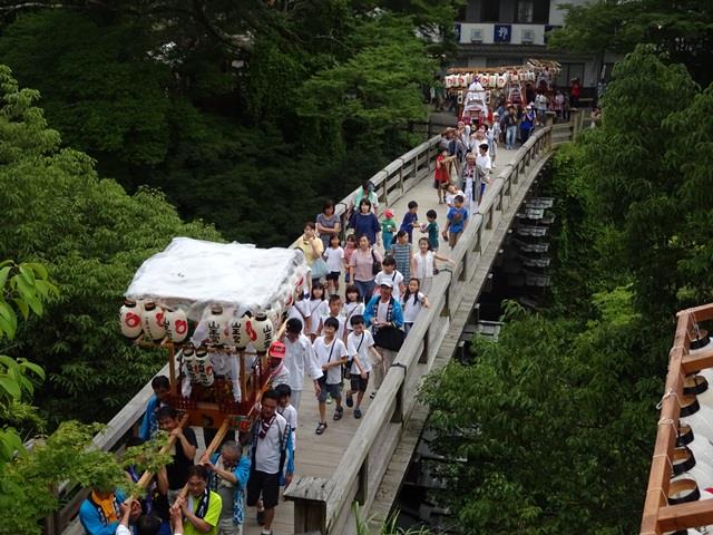 式典の後、神輿が日本三奇橋の上を渡る姿は見応えがあります。