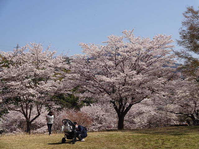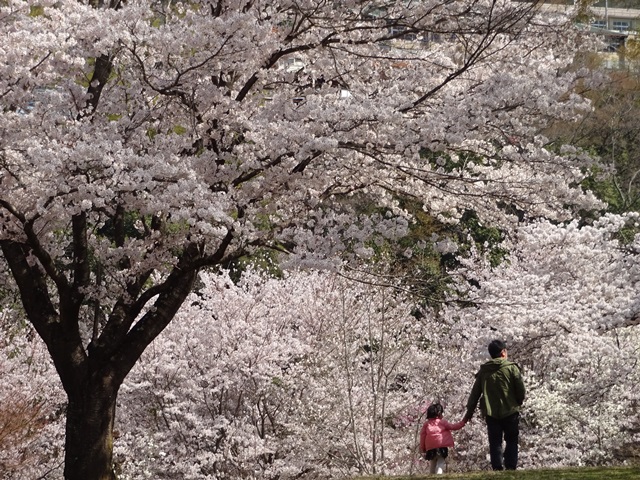 満開の桜で彩られる近隣公園、お弁当をもった家族ずれの姿。
