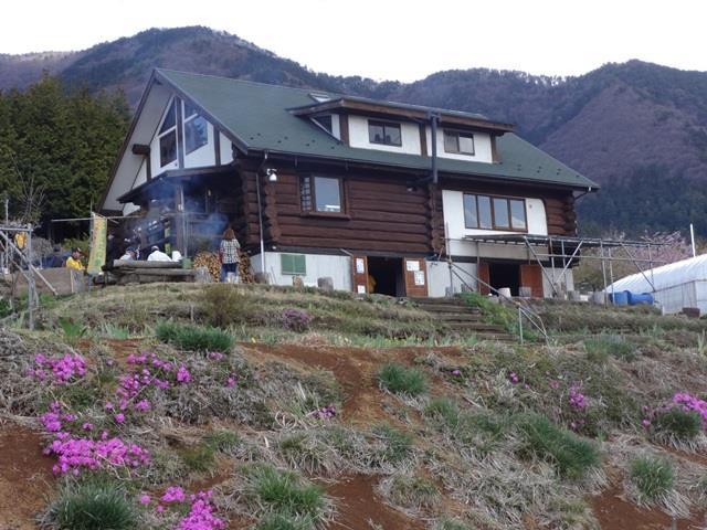 バス停より3分程歩くとログハウスに到着。見晴らしの良い広ーい農園とお天気が良ければ