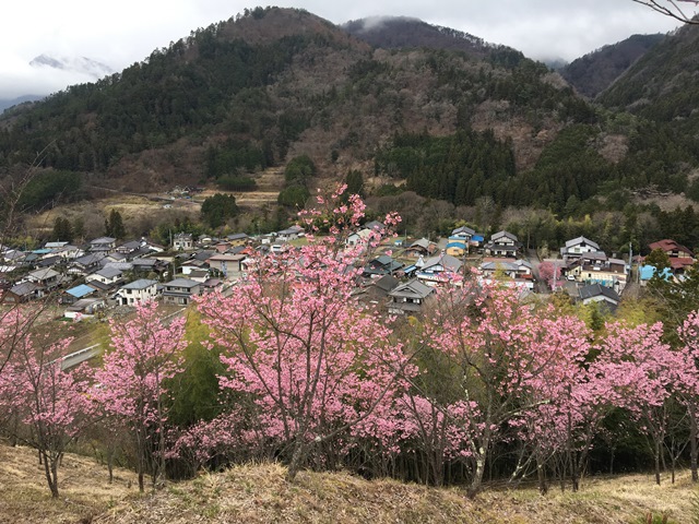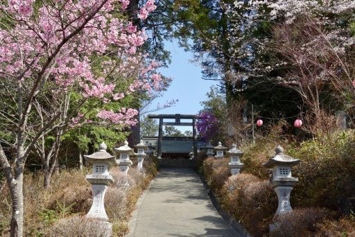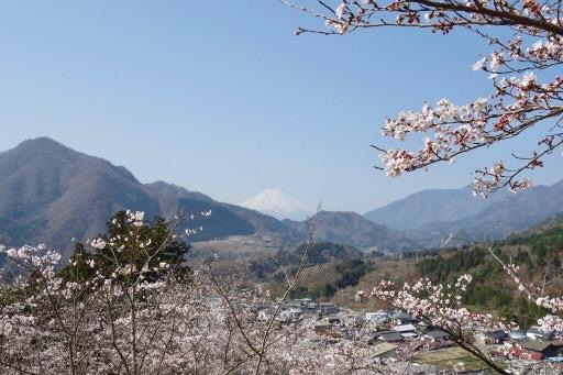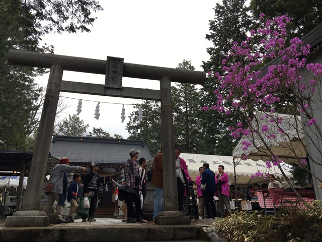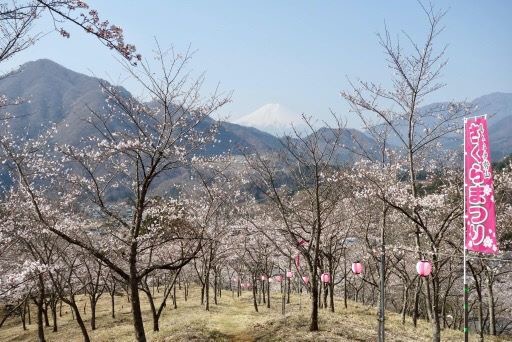 ⑪上真木バス停より徒歩10分ほど歩けば、桜3000本の里、お伊勢山山頂へ到達。富士山の絶景スポットとして人気の秀麗富嶽十二景のひとつです。さくら祭り当日は午後1時30分から山頂の大神社で、真木地区の人々により賑やかにお祭りが開催されます。