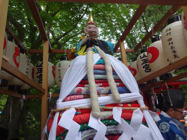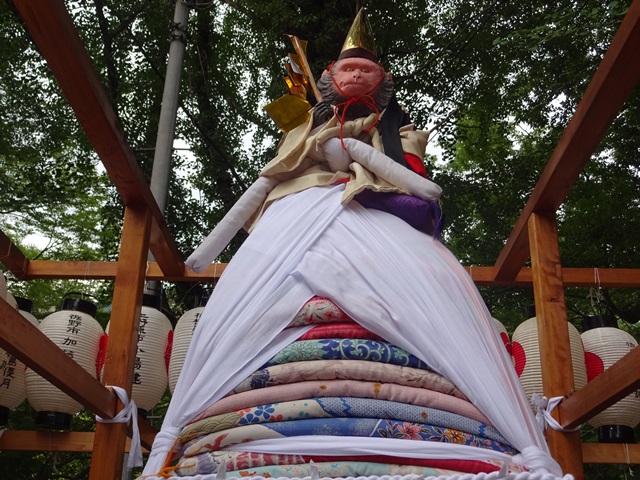 猿神輿の台座に積み上げた座布団にご神体の猿が鎮座、台座の周りには今年生まれた新生児の名前を記した提灯が並び、健やかな成長を祈願し奉納されます。