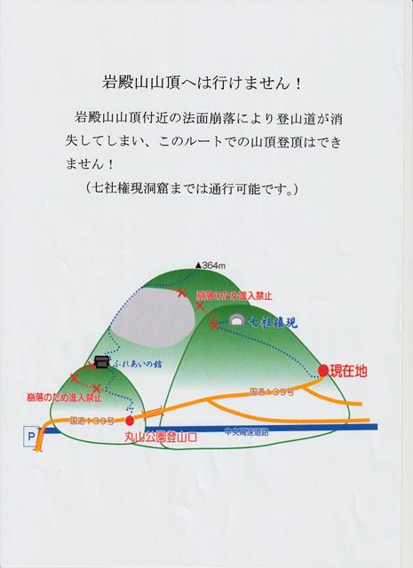 岩殿山山頂付近の法面崩落により七社権現洞窟までの登山道は消失してしまい現在も未だ進入禁止となっています。