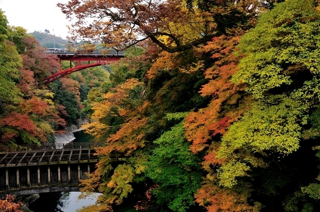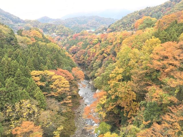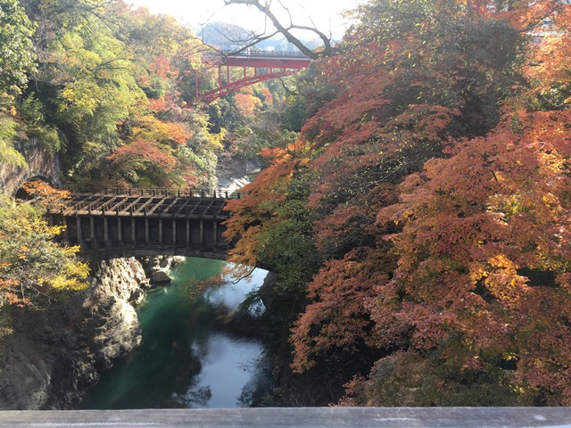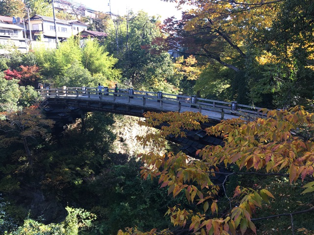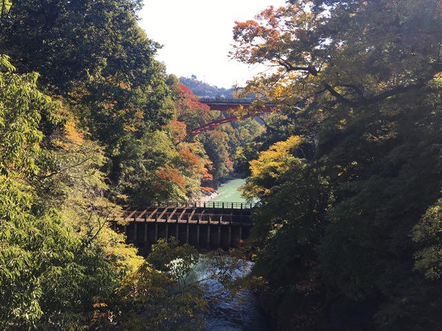 標高300m足らずの日本三奇橋の猿橋。2017年10月26日の様子です。まだ色づきはじめ。