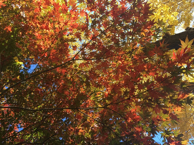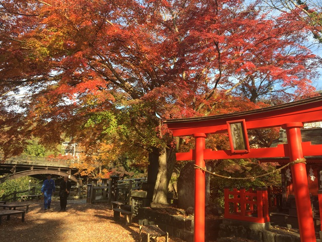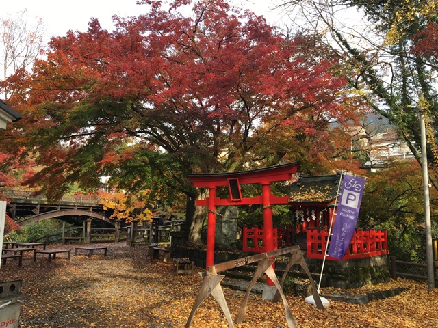 11月3日の橋のたもとの山王宮のもみじの様子。