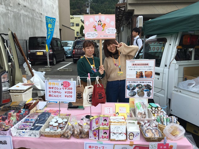 大月市の秋の一大イベントである今年の軽トラ市には、イベント会場一杯に約50店舗ものお店が並び、我が観光協会はイベント会場入口の1番の場所で出店しました。笑顔がとってもかわいい大月短大の学生さんが一生懸命お手伝いをしてくれました。感謝♥