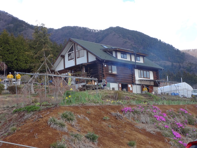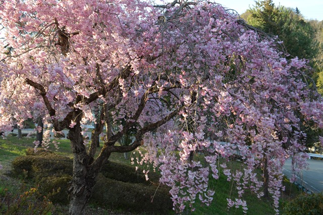 エコの里はのログハウス入口の枝垂れ桜は3分咲き