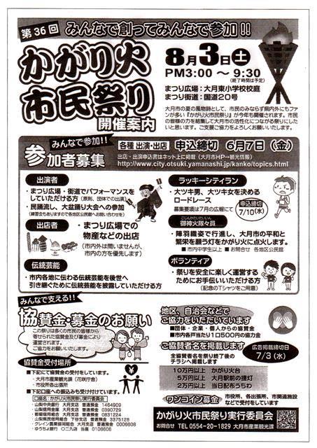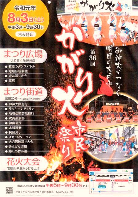 大月市の夏の一大イベント:今年の『第36回 かがり火市民祭り』は、令和元年 8月3日(土)午後3時~午後9時半(荒天順延)開催いたします。毎年このお祭りを楽しみに遠方からお越しくださるお客様も年々増え、大変賑やかなお祭りとなっています。今年も市民が一丸となって各会場でお祭りを盛り上げます。それぞれの会場での見どころ・楽しみ方をご案内いたします。