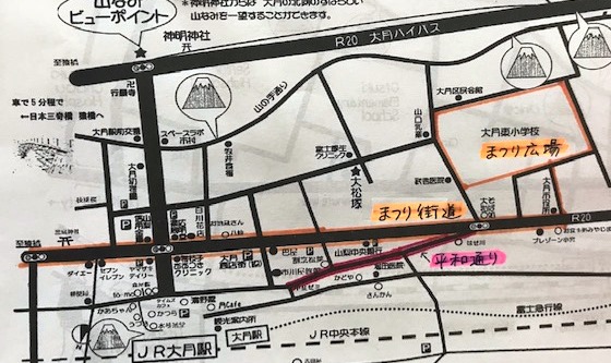 まつり街道(国道20号 イオン大月駐車場~大月市役所)・まつり広場(大月東小学校校庭)は誰もが知る賑わいスポットですが、今回は平和通りのイベントをご紹介します。