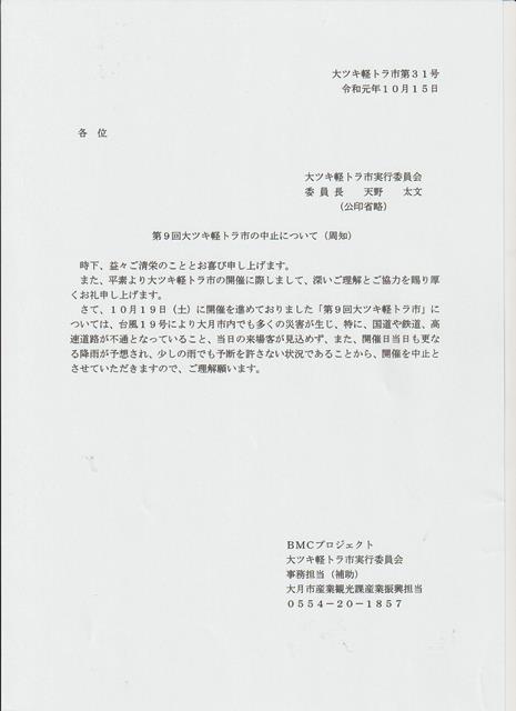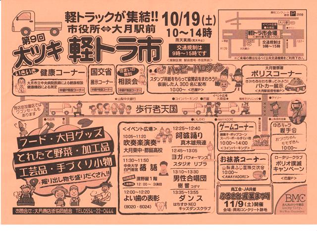 大月駅前交差点から大月市役所前までの国道20号線を通行止めにして10月19日(土)開催を予定していました「第9回大ツキ軽トラ市」につきまして、台風19号により大月市内でも多くの災害が生じ、各交通機関が不通となっていることなどを考慮して、本日開催の中止が決定されました。