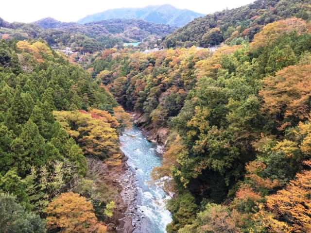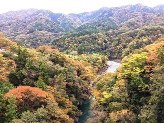 朝晩の寒暖差が厳しくなり渓谷はグッと色付きを増し、橋から見る高畑山や倉岳山も綺麗に色付いています。渓谷周辺の紅葉は今が見頃となっています‼️