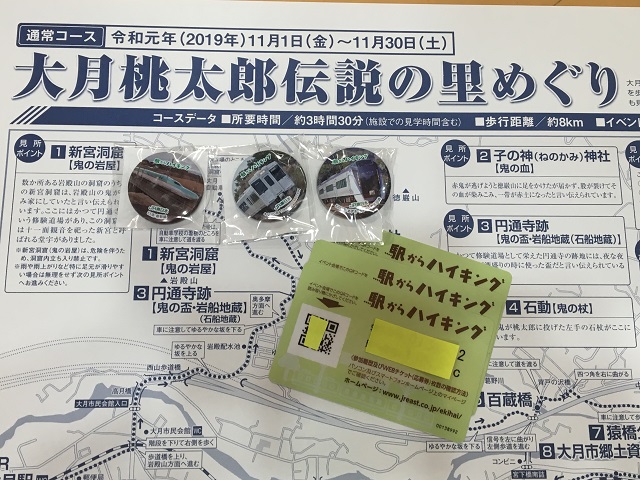 と銘打ってのコース設定をしていただき、所要時間3時間30分、歩行距離8キロメートルのマップを作成していただきました。こちらは、JR中央線に乗って大月駅で降り、大月駅前の観光案内所がスタート地点とされています。