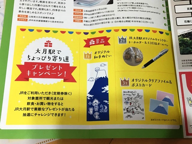 中にはJR大月駅社員さんおすすめの大月のいいところ♪いいものがたくさん載っています。対象の場所やお店で観光または飲食、お買い物の際にスタンプをもらい、お帰りの際に押印済のマップを改札口で提示いただくと抽選で景品が当たるようです。
