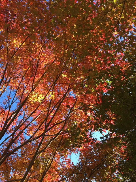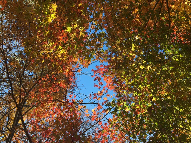 道路わきにあるもみじの群生。あまり色がきれいでないように見えますが、一歩足を踏み入れると陽に透けるもみじは様々な色で迎えてくれました。