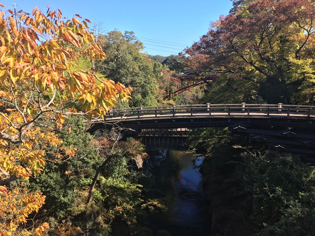 JR梁川駅から徒歩2,3分。梁川大橋のうえから見る渓谷の紅葉は見ごろを迎えています。