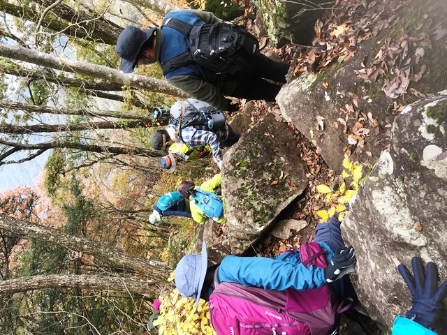 昼食後はいよいよむすび山へ縦走…急勾配の岩場の登山道は滑りやすいので慎重に進みます