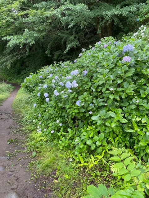 ここからは実際に猿橋へいった様子をお伝えします。私たちは6月7月に猿橋を訪れました。6月は猿橋を川の方に下っていった先にある「アジサイ」を見に行きました。写真のように川に沿って約数十メートルにわたって様々な色のアジサイが咲き誇っており、そのさきにある「猿橋公園」の周りにも多くのアジサイが見ることが出来ました。6月の梅雨の時期ということもあり、地盤が緩んでいるところが数か所あったのでアジサイを見に行く際には十分足元に気を付けて訪ねていただきたいです。