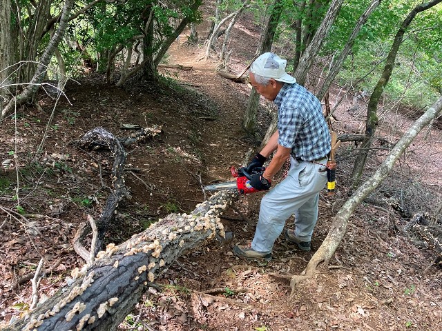 登山道中を塞ぐこうした倒木を撤去しながら先に進みます。定期的なこうした作業は道迷いや怪我等に欠かせない作業となります。本当に頭が下がります。