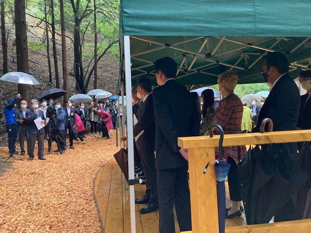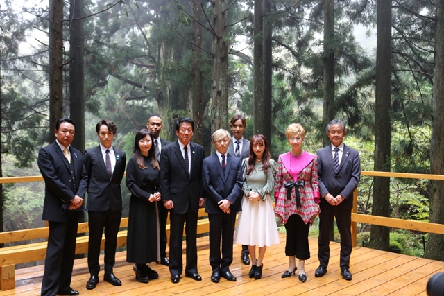 ご参列された各プロジェクトのスペシャルサポーター(左から山本譲二様・EXILE TETSUYA様・伍代夏子様・EXILE NESMITH様・杉良太郎様・w-inds.千葉涼平様・w-inds.橘慶太様・AKB48向井地美音様・瀬川瑛子様)の皆様が、大月市に表敬訪問にお越しくださいました!!雨もやみ矢立の杉をバックに写真撮影が行われました。超豪華なステージ!!
