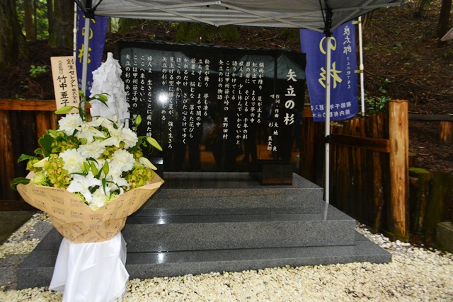 1000年の時を超え今もなおたくましく人々を見守り続ける矢立の杉。戦国時代に笹子峠を通って合戦に赴く武士が必勝を願ってこの杉に矢を射ったことがその名の由来と言われています。歌手の杉良太郎氏により「矢立の杉」曲が発売され、舞台公演も行われました。これを期に大月市は、矢立の杉が末永く大勢の皆様から親しまれるように歌碑を設置し、杉氏からは両面地蔵菩薩を寄付していただき、毎年年次大祭が行われてきました。10回目となる今回は、ウッドデッキもリニューアル(改修前の2倍の広さ)し、杉良太郎・伍代夏子ご夫妻をはじめ、多くの芸能人の方々も参列され、厳かに年次大祭が執り行われました。