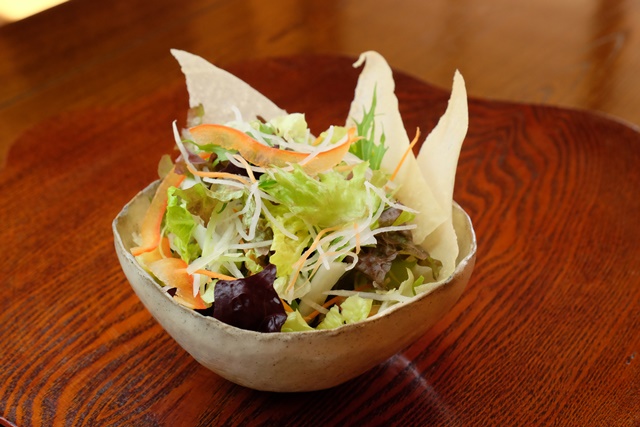 お客様がお見えになってから作るすりおろし林檎ドレッシングのサラダも人気。