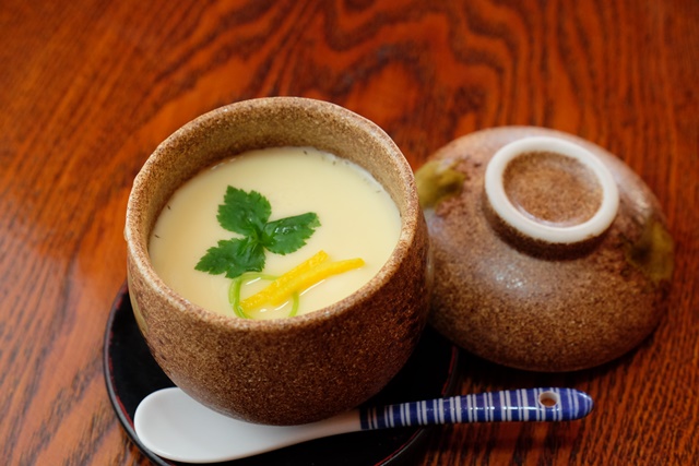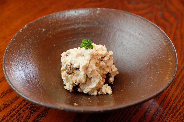 京芋をお出汁で炊いて茶巾絞りにして銀あんをまとわせた一品。