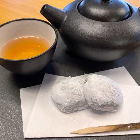 「笹一×笹子餅セット」は、クランドカフェを手掛ける笹一酒造のすぐ近くにある「みどりや」という和菓子のお店で作られ、地元の名物でもある「笹子餅」とドリンクが楽しめるメニューです。笹子餅は一見白いですが、切ってみるとヨモギの緑色が鮮やかで、中には粒あんが入っていました。モチモチ食感のお餅と甘い粒あんで、甘いもの好きの方や和菓子好きの方には特におすすめです。お餅は2つあったのですが、おいしすぎてなくなるのがとても早く感じました。また、ドリンクは、今回ほうじ茶を頼みましたが、この他にも、紅茶とコーヒーから選ぶことができ、コーヒーは、甲府市で人気のお店である「AKITO COFFEE」のコーヒーを使用していました。