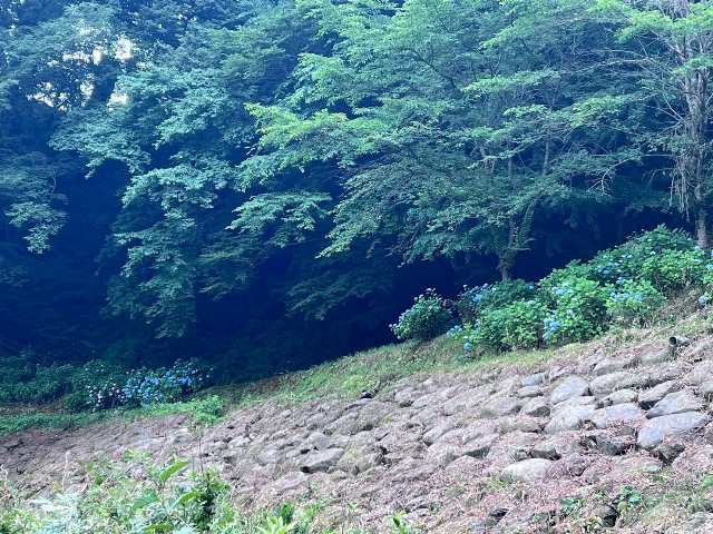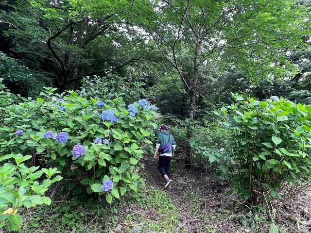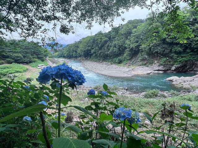 猿橋公園から日本三奇橋に続くおよそ150メートルほどの遊歩道沿いにアジサイが咲き、並行して流れる桂川と鳥のさえずりを楽しみながら歩いていただけます。