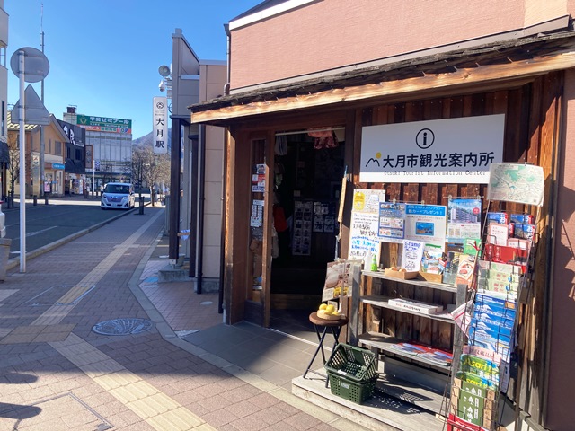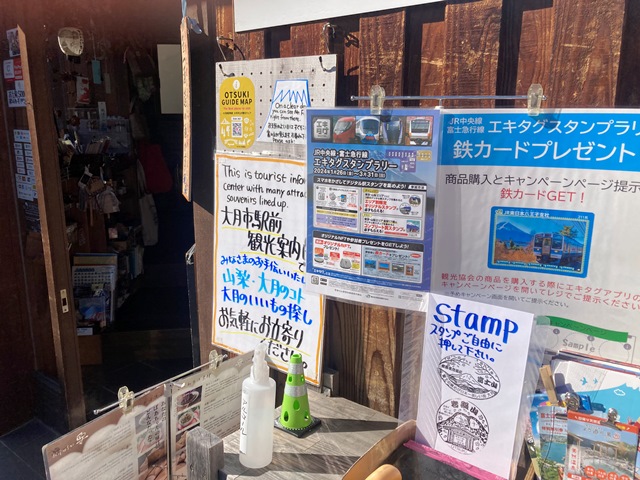 ブルーのカードを配布している大月駅前観光案内所